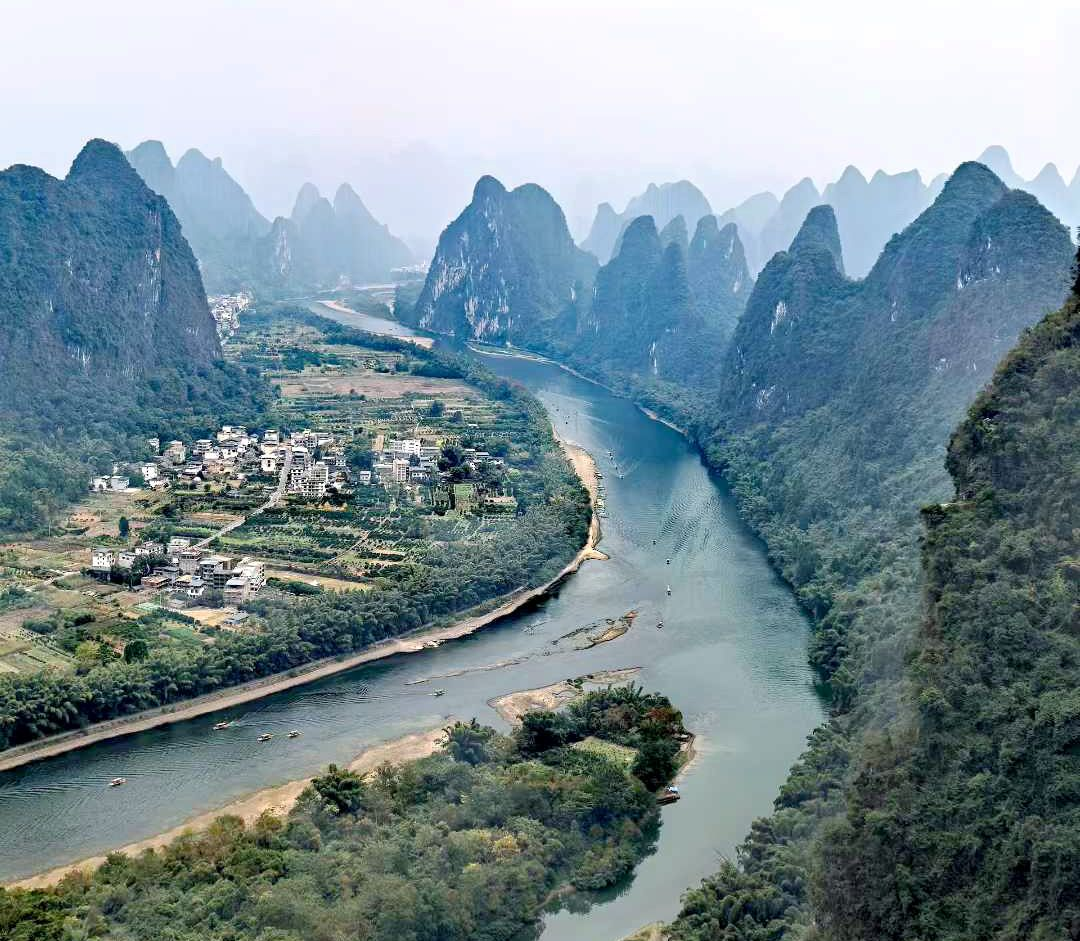 Die vielleicht schönste Landschaft des Li-Flusses erstreckt sich südlich von Guilin bei Yangshuo. Hier können Sie auf einem Bambusfloß den Yulong hinabgleiten, einen idyllischen Seitenarm des Li. Ein weiteres Highlight ist eine Wanderung durch die Reisterrassen, gefolgt vom Aufstieg auf den Xianggong-Berg. Von seinem Gipfel werden Sie mit einem atemberaubenden Blick aus der Vogelperspektive belohnt: Der Li-Fluss schlängelt sich wie ein smaragdgrünes Band durch ein unendliches Meer von Gipfeln.